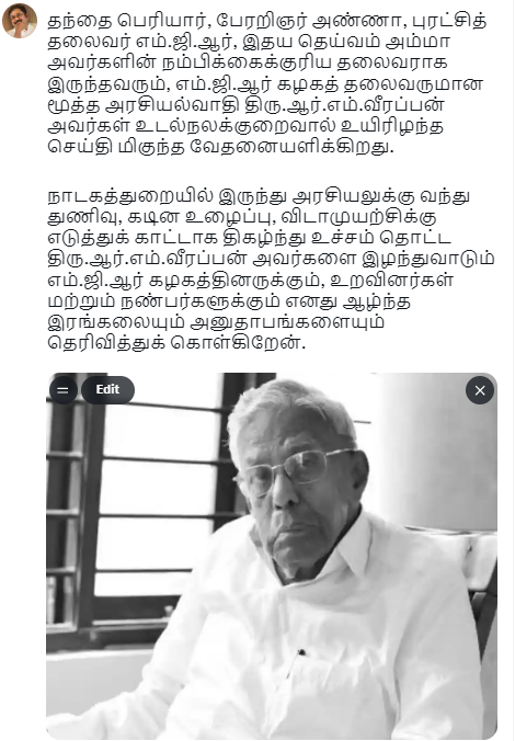 April 9, 2024 In ticker‚ பத்திரிகை வெளியீடுகள்‚ பொதுச்செயலாளர் அறிக்கைகள் | Secretary General Reports 0 தந்தை பெரியார், பேரறிஞர் அண்ணா, புரட்சித் தலைவர் எம்.ஜி.ஆர், இதய தெய்வம் அம்மா அவர்களின் நம்பிக்கைக்குரிய தலைவராக இருந்தவரும், எம்.ஜி.ஆர் கழகத் தலைவருமான மூத்த அரசியல்வாதி திரு.ஆர்.எம்.வீரப்பன் அவர்கள் உடல்நலக்குறைவால் உயிரிழந்த செய்தி மிகுந்த வேதனையளிக்கிறது. நாடகத்துறையில் இருந்து அரசியலுக்கு வந்து துணிவு, கடின உழைப்பு, விடாமுயற்சிக்கு எடுத்துக் காட்டாக திகழ்ந்து உச்சம் தொட்ட திரு.ஆர்.எம்.வீரப்பன் அவர்களை இழந்துவாடும் எம்.ஜி.ஆர் கழகத்தினருக்கும், உறவினர்கள் மற்றும் நண்பர்களுக்கும் எனது ஆழ்ந்த இரங்கலையும் அனுதாபங்களையும் தெரிவித்துக் கொள்கிறேன்.
