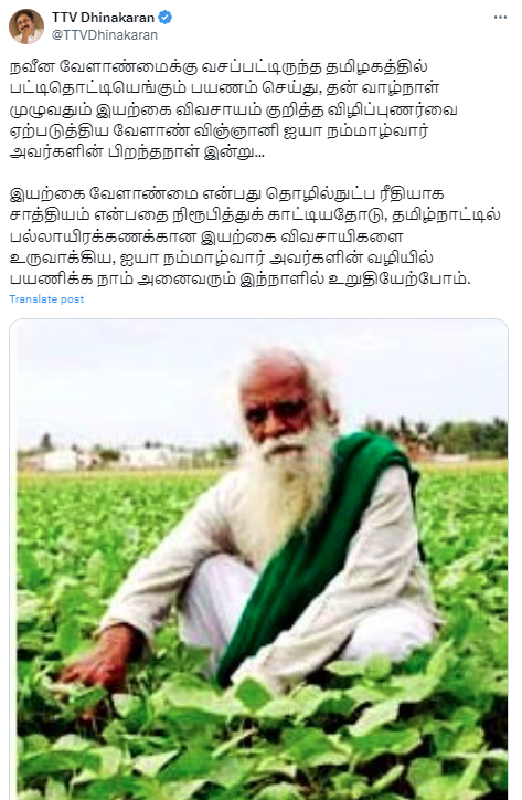 April 6, 2024 In ticker‚ பத்திரிகை வெளியீடுகள்‚ பொதுச்செயலாளர் அறிக்கைகள் | Secretary General Reports 0 நவீன வேளாண்மைக்கு வசப்பட்டிருந்த தமிழகத்தில் பட்டிதொட்டியெங்கும் பயணம் செய்து, தன் வாழ்நாள் முழுவதும் இயற்கை விவசாயம் குறித்த விழிப்புணர்வை ஏற்படுத்திய வேளாண் விஞ்ஞானி ஐயா நம்மாழ்வார் அவர்களின் பிறந்தநாள் இன்று… இயற்கை வேளாண்மை என்பது தொழில்நுட்ப ரீதியாக சாத்தியம் என்பதை நிரூபித்துக் காட்டியதோடு, தமிழ்நாட்டில் பல்லாயிரக்கணக்கான இயற்கை விவசாயிகளை உருவாக்கிய, ஐயா நம்மாழ்வார் அவர்களின் வழியில் பயணிக்க நாம் அனைவரும் இந்நாளில் உறுதியேற்போம்.